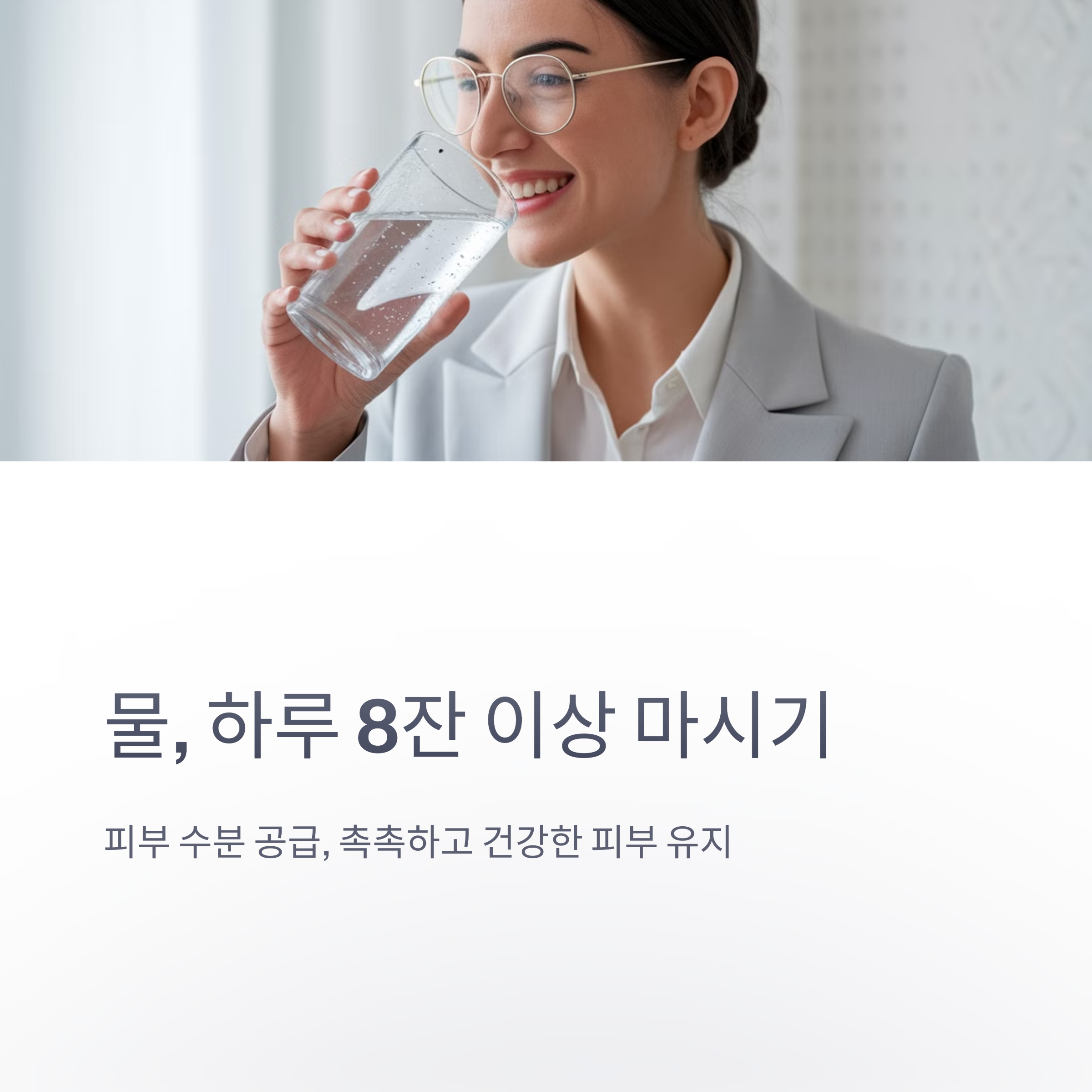 | 수분 섭취 | 피부 속부터 촉촉함 유지 | 하루 1.5~2L 물 섭취 |